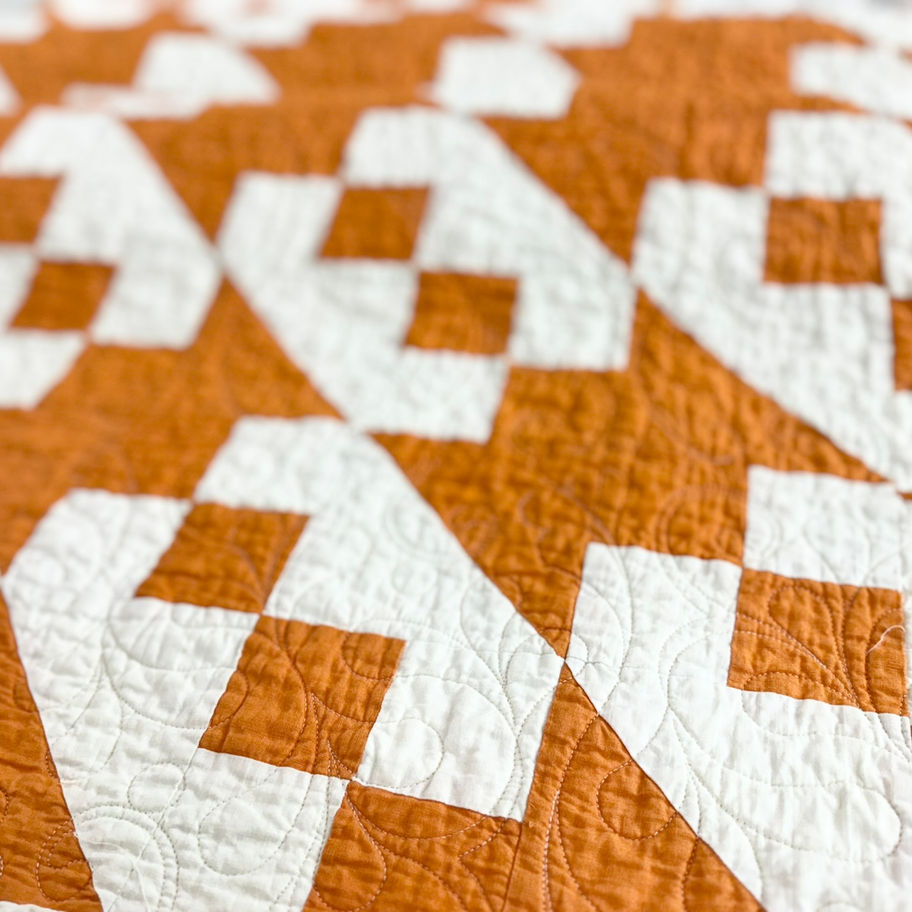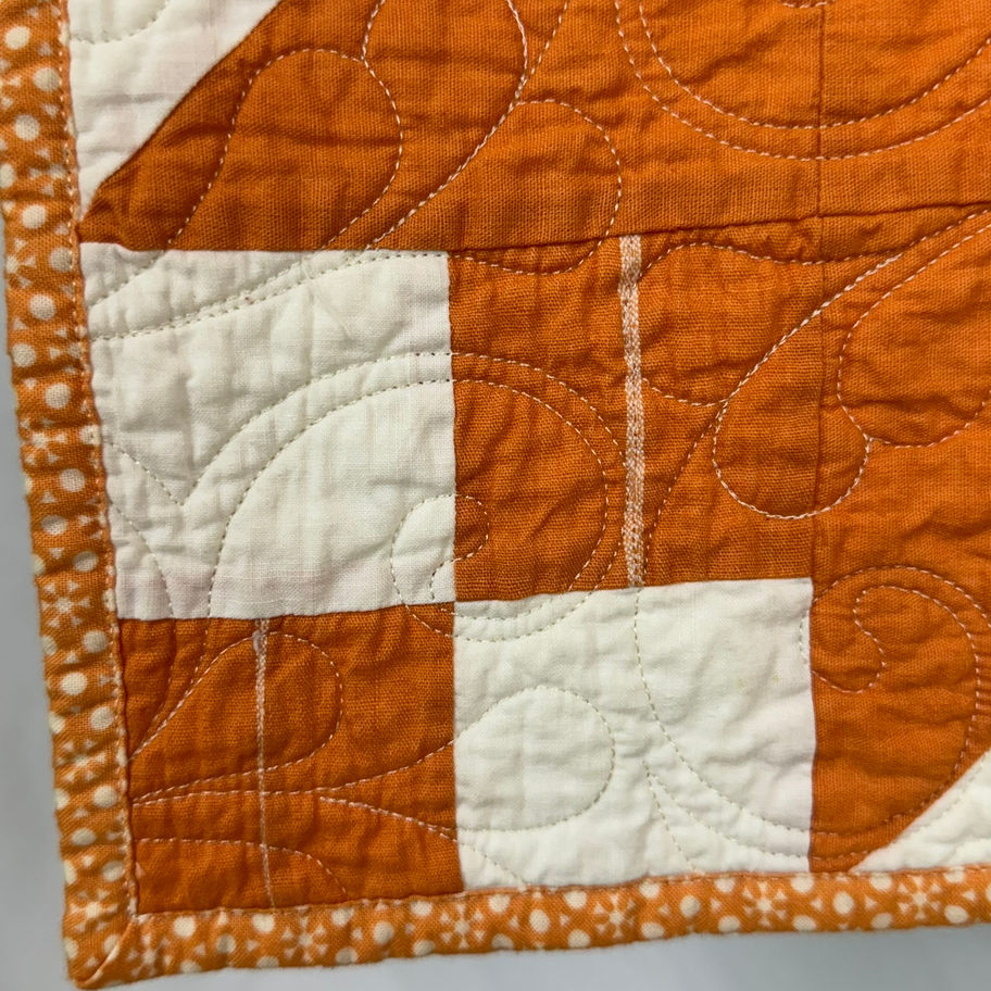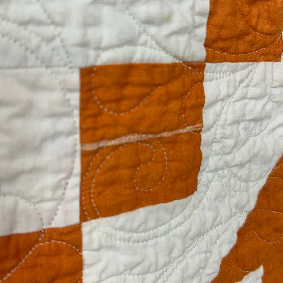 She has five little square orange blocks that are pieced to make their perfect size. She must have been at the end of her orange fabric because you can see the smallest bit of the selvedge in those five tiny squares. You can see this in the photos. Autumn is one of my favorite quilts that we have reawakened. She is so soft, her colors are stunning and she will add so much to your home.